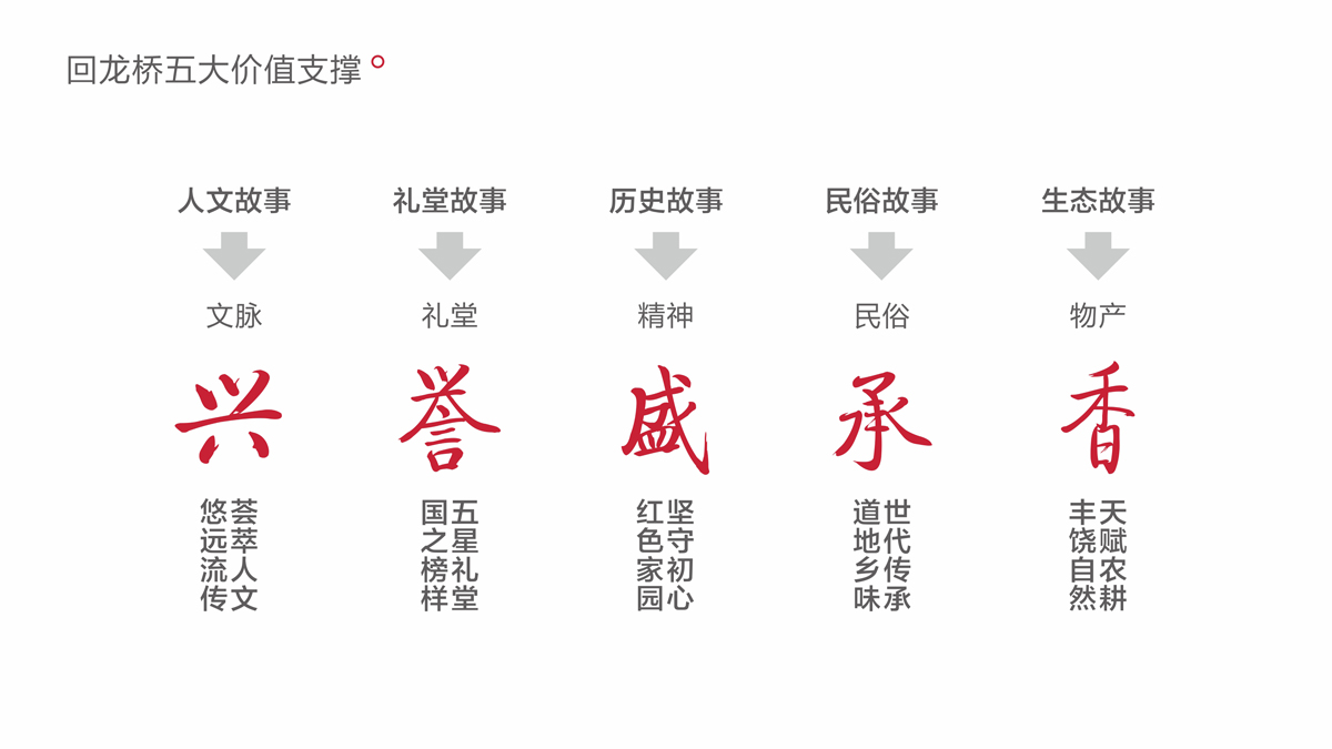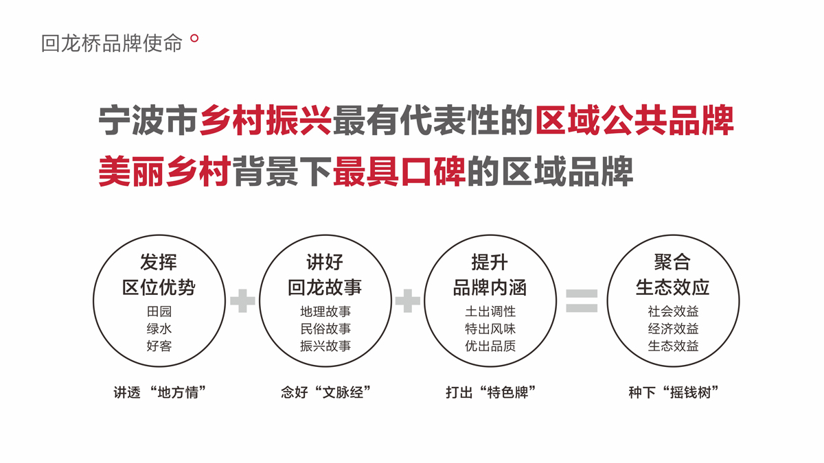乡村振兴贵在激发区域内生动力,品牌强农,促进农品增值,农业增效,农民增收。回龙村作为宁波鄞州的璀璨明珠之一,红色印记、五星文化礼堂、回龙小葱,拥有深厚的人文底蕴。整合回龙村文化艺术、生态农业资源,明目标,重价值,靓形象,优结构,强传播,打造回龙桥区域公用品牌,不仅能让回龙村的小葱、瓜菜、种殖等产业跨越式崛起,也能使回龙村成为浙江乡村振兴代表,中国乡村振兴的样板。