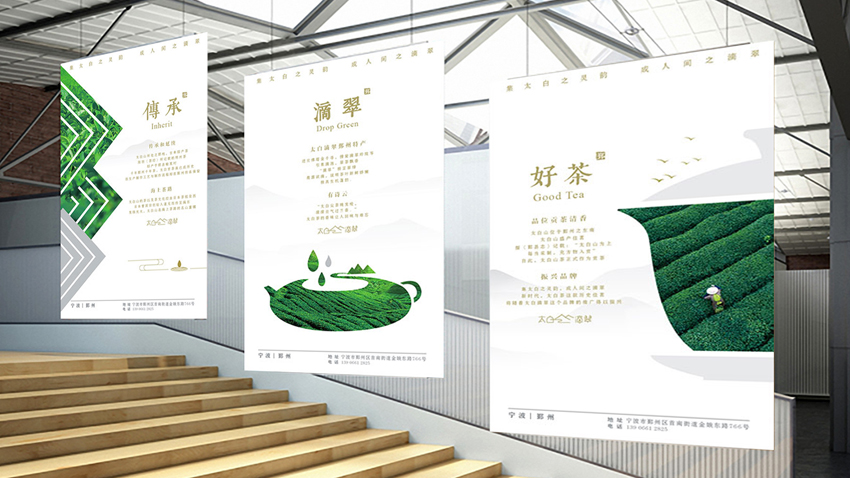 当全国各地区域特色农产品品牌建设一片火热的时候,区农业局与智慧天成取得联系,打造区域茶品牌。智慧天成认为,区域公用品牌名称,要兼具地域性、文化性和授权属性。地域就是根,“太白滴翠”以太白山地名取名,借用天童太白的地域熟知度。“太白”两字将产地与其他地域建立差异。以“太白”为源点,将太白山脉、茶园、茶文化以及禅文化,进行完美演绎,形成极简极致的品牌标识。一目了然,透着仙气,将茶叶背后深厚的传统茶文化进行场景式高效传达,创作“集太白之灵韵·成人间之滴翠”的超级品牌口令,重塑鄞州茶叶品牌价值,助力鄞州茶产业的品牌逆袭。