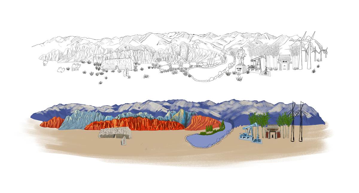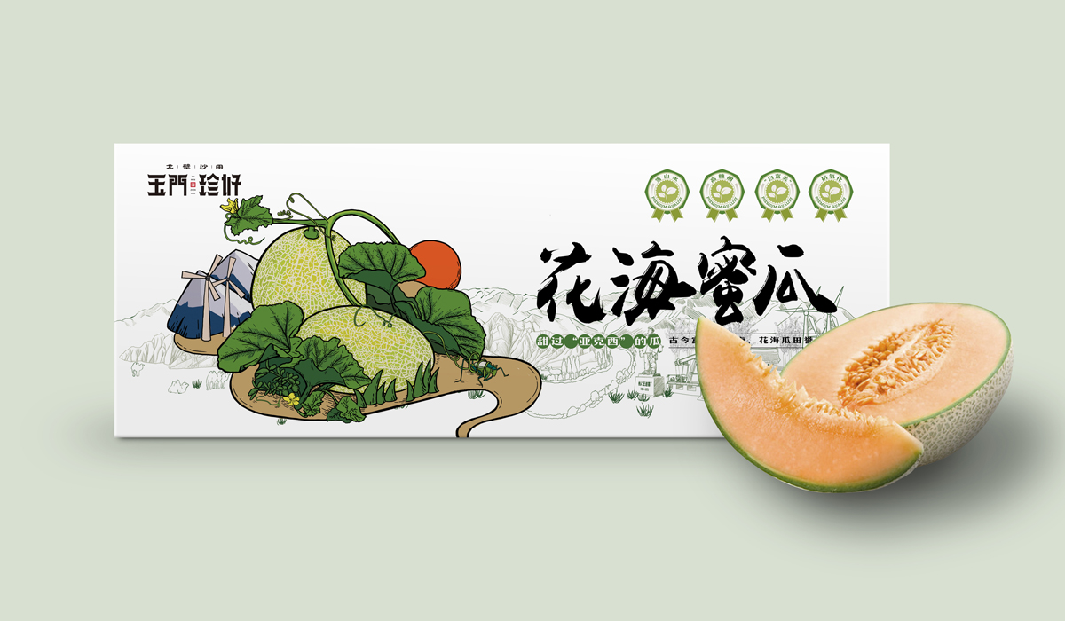 玉门珍好项目从品牌命名到形象终端落地,服务内容: 品牌全案策划,品牌定位,品牌调性,卖点提炼,品牌命名,超级符号设计,LOGO设计,VI设计,包装设计,终端形象设计,后期维护等,产品分为:黑枸杞、红枸杞、胡麻油、韭菜、葵花籽、辣椒、藜麦、蜜瓜、蟠桃、葡萄、羊肉、羊羔肉和人参果13个类别,为了树立一套有地域性、有产品个性和高度统一性的形象识别,智慧天成团队受当地政府委托,用时半个月几乎走遍玉门地标,充分了解掌握当地产业和文化,并提炼玉门最具代表性的人文、建筑、地理环境等元素,纯手绘插画形式把产品和玉门风情完美融合,形成一幅幅有创意的、生动的、美好情怀的迷人画面。